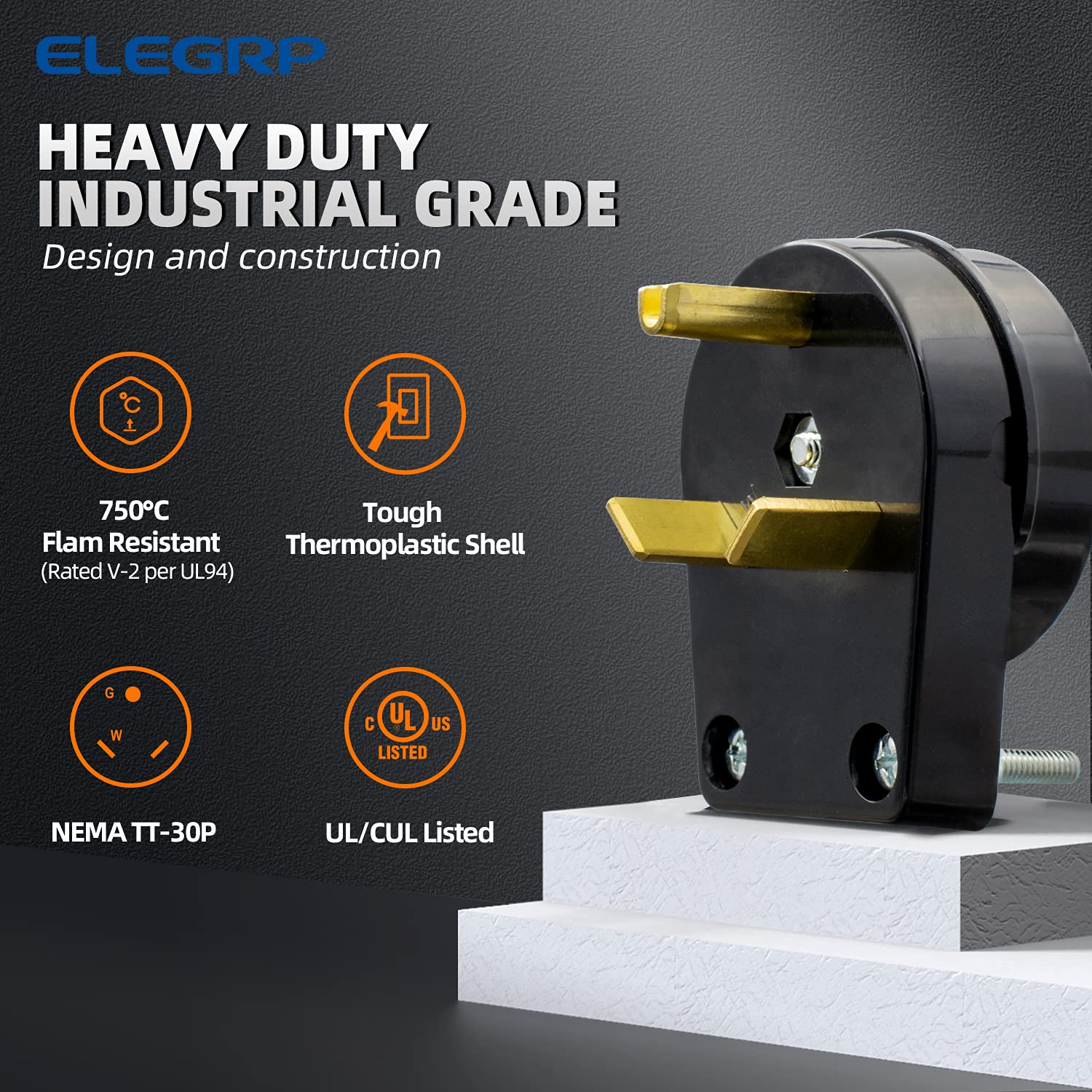 ELEGRP 30 Amp RV Receptacle, Flush Mount NEMA TT-30R Outlet & Heavy Duty NEMA TT-30P Plug, 125V, 2 Pole 3 Wire, UL Listed
