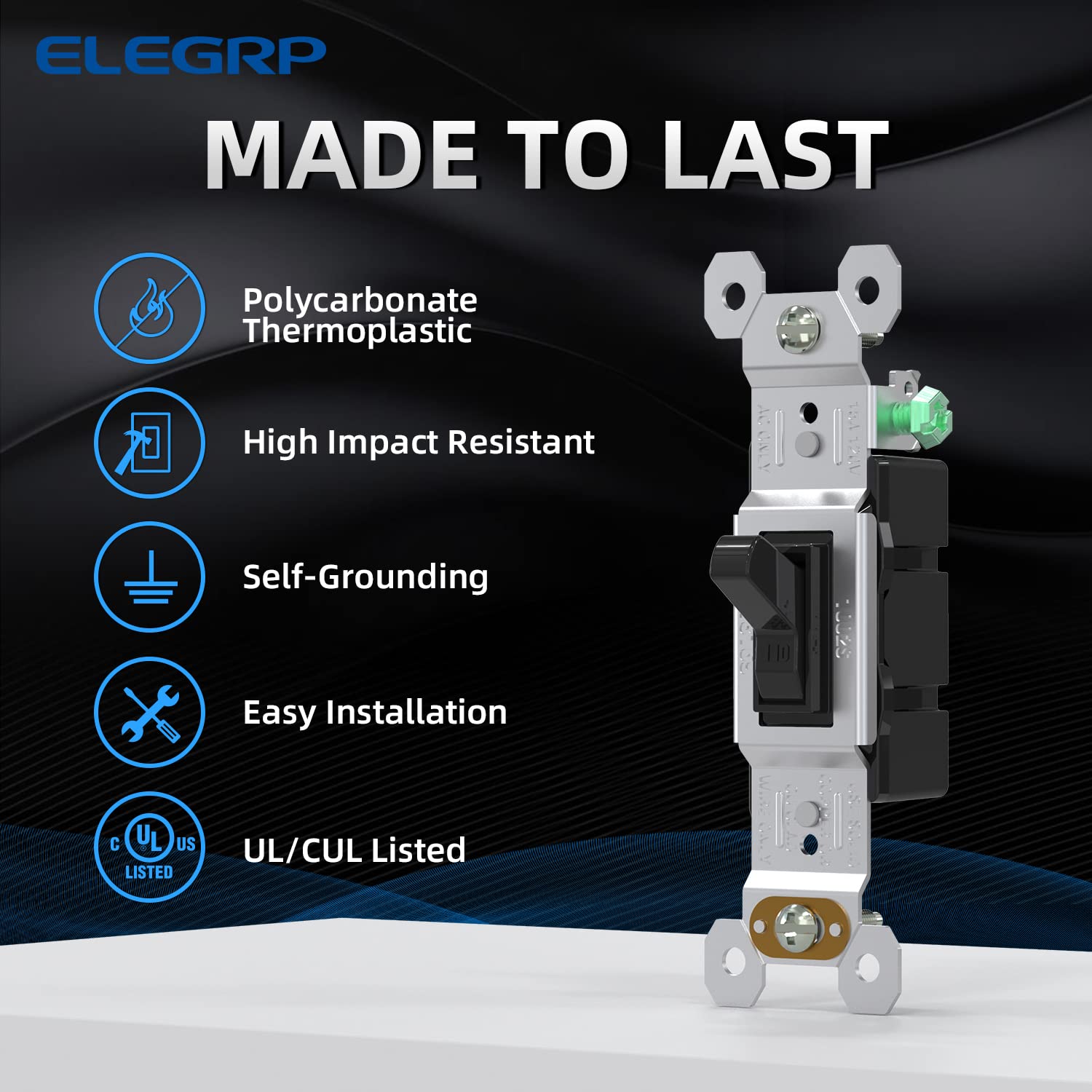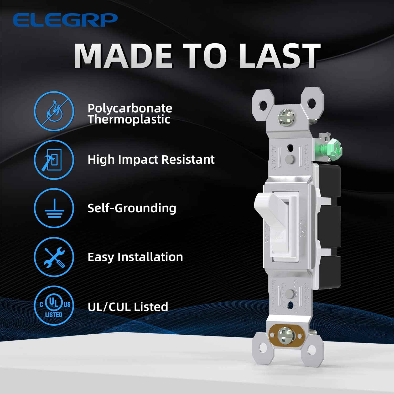 The ELEGRP Single Pole Toggle Light Switch is designed for simplicity and durability. Its quiet toggle action, quick wiring options, and self-grounding feature make it a practical choice for residential and commercial applications.